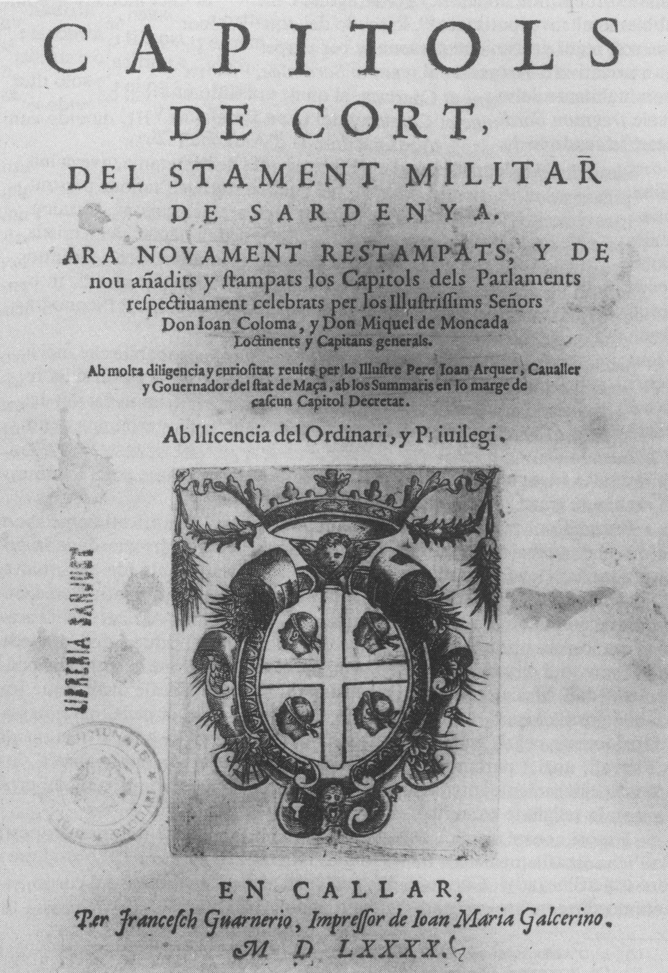 Frontespizio dei Capítols de Cort del Stament militar de Sardenya, pubblicati a Cagliari nel 1590.